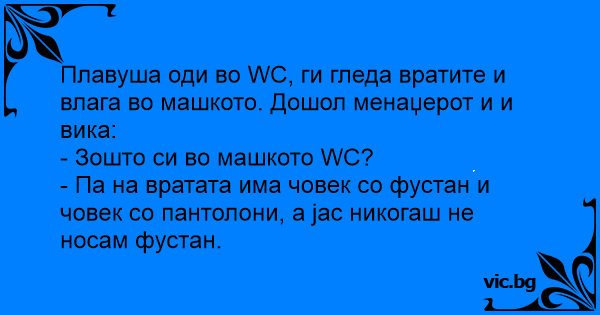 Плавуша оди во WC, ги гледа вратите и влага во машкото. Дошол менаџерот и и вика:
