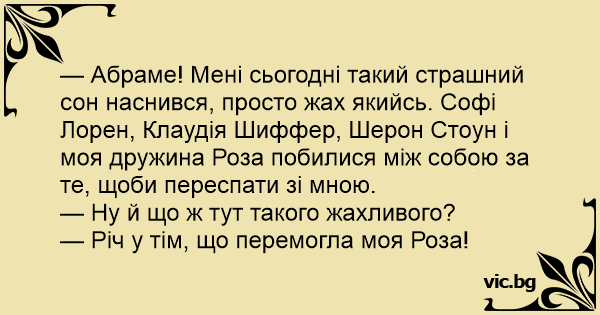 — Абраме! Мені сьогодні такий страшний сон наснився, просто жах якийсь. Софі Лорен, Клаудія Шиффер, Шерон Стоун і моя дружина Роза побилися між собою за те, щоби переспати зі мною.