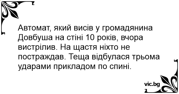 Автомат, який висів у громадянина Довбуша на стіні 10 років, вчора вистрілив. На щастя ніхто не постраждав. Теща відбулася трьома ударами прикладом по спині.