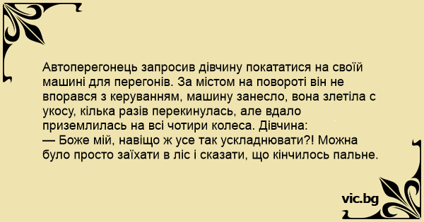 Автоперегонець запросив дівчину покататися на своїй машині для перегонів. За містом на повороті він не впорався з керуванням, машину занесло, вона злетіла с укосу, кілька разів перекинулась, але вдало приземлилась на всі чотири колеса. Дівчина: