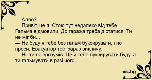 — Не буду я тебе без гальм буксирувати, і не проси. Евакуатор тобі зараз викличу.