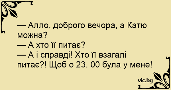 — А і справді! Хто її взагалі питає?! Щоб о 23. 00 була у мене!