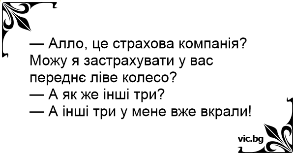 — Алло, це страхова компанія? Можу я застрахувати у вас переднє ліве колесо?