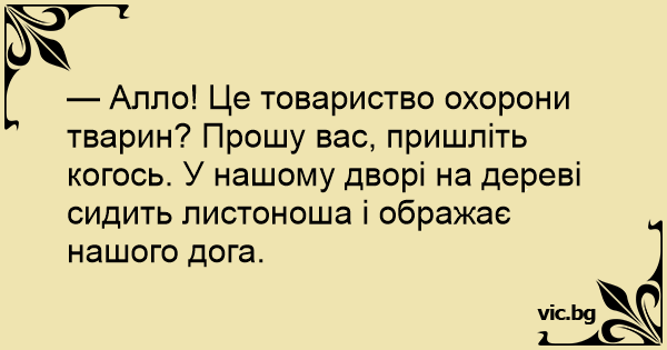 — Алло! Це товариство охорони тварин? Прошу вас, пришліть когось. У нашому дворі на дереві сидить листоноша і ображає нашого дога.