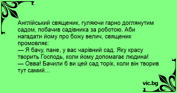 Англійський священик, гуляючи гарно доглянутим садом, побачив садівника за роботою. Аби нагадати йому про божу велич, священик промовляє: