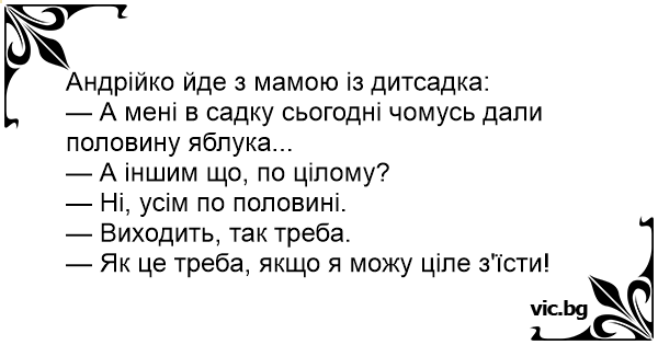 — А мені в садку сьогодні чомусь дали половину яблука...