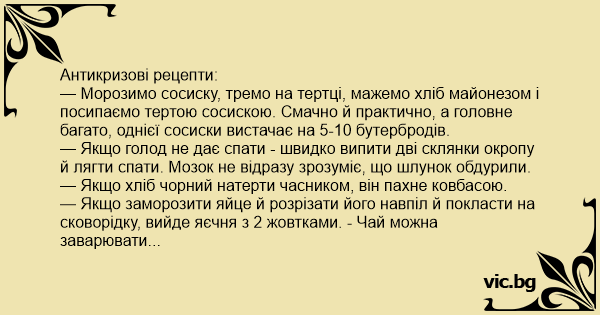 — Якщо хліб чорний натерти часником, він пахне ковбасою.