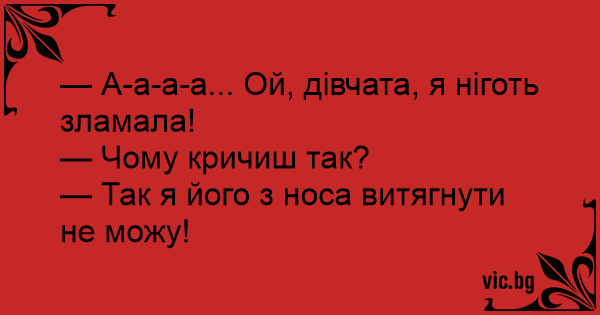 - А-а-а-а ... Момичета, счупих си нокътя! - Защо крещиш така? - Не мога да си го извадя от носа!