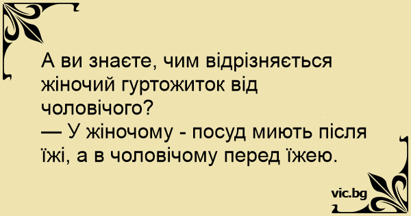 — У жіночому - посуд миють після їжі, а в чоловічому перед їжею.