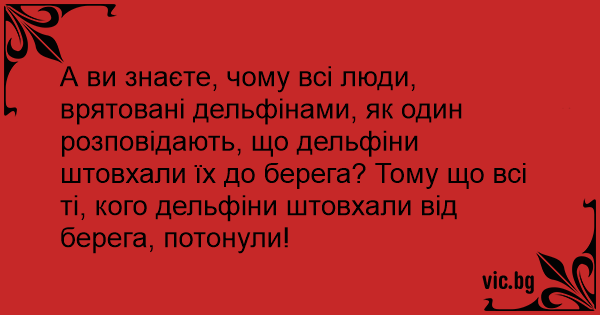 А ви знаєте, чому всі люди, врятовані дельфінами, як один розповідають, що дельфіни штовхали їх до берега? Тому що всі ті, кого дельфіни штовхали від берега, потонули!
