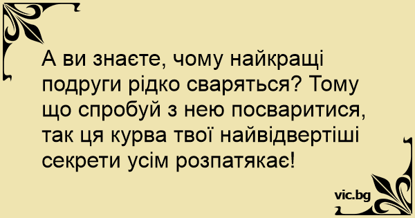 А ви знаєте, чому найкращі подруги рідко сваряться? Тому що спробуй з нею посваритися, так ця kуpba твої найвідвертіші секрети усім розпатякає!