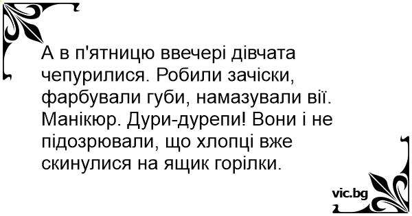 А в п'ятницю ввечері дівчата чепурилися. Робили зачіски, фарбували губи, намазували вії. Манікюр. Дури-дурепи! Вони і не підозрювали, що хлопці вже скинулися на ящик горілки.