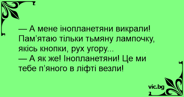 — А як же! Інопланетяни! Це ми тебе п’яного в ліфті везли!