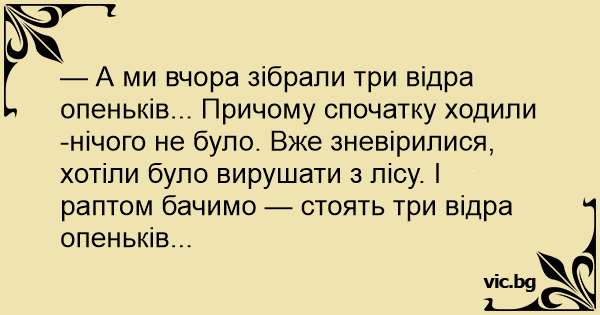 — А ми вчора зібрали три відра опеньків... Причому спочатку ходили-нічого не було. Вже зневірилися, хотіли було вирушати з лісу. І раптом бачимо — стоять три відра опеньків...