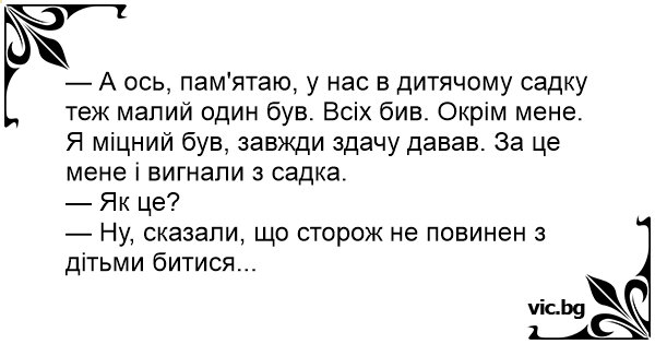 — А ось, пам'ятаю, у нас в дитячому садку теж малий один був. Всіх бив. Окрім мене. Я міцний був, завжди здачу давав. За це мене і вигнали з садка.