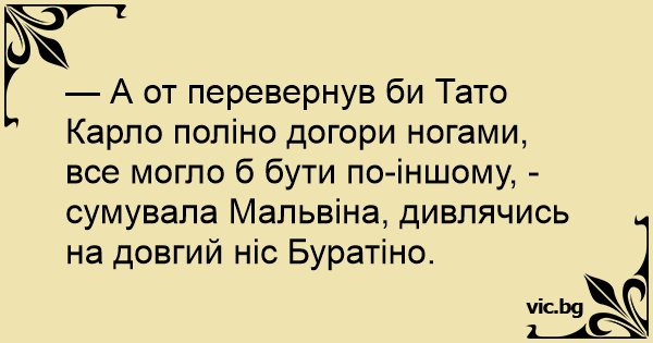 — А от перевернув би Тато Карло поліно догори ногами, все могло б бути по-іншому, - сумувала Мальвіна, дивлячись на довгий ніс Буратіно.