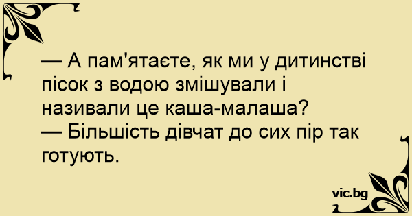 — А пам'ятаєте, як ми у дитинстві пісок з водою змішували і називали це каша-малаша?