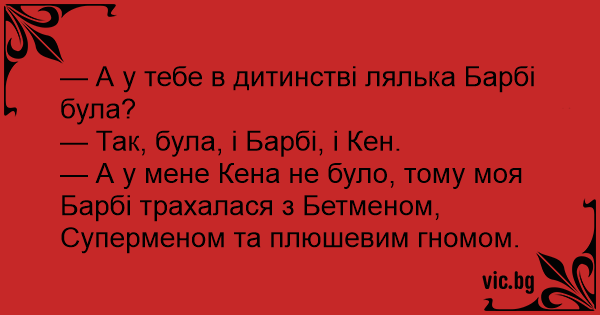— А у мене Кена не було, тому моя Барбі трахалася з Бетменом,