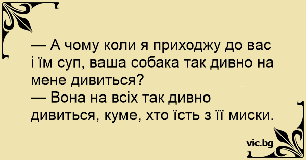 — Вона на всіх так дивно дивиться, куме, хто їсть з її миски.