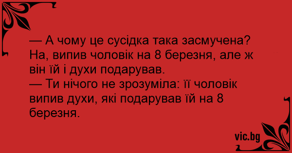 — Ти нічого не зрозуміла: її чоловік випив духи, які подарував їй на 8 березня.