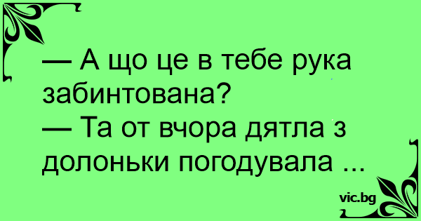 — А що це в тебе рука забинтована?<br />— Та от вчора дятла з долоньки погодувала ...