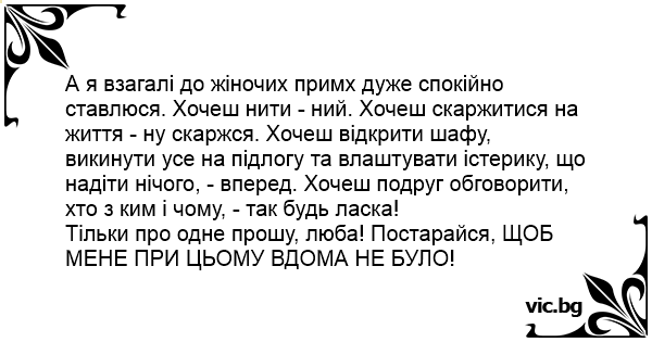 А я взагалі до жіночих примх дуже спокійно ставлюся. Хочеш нити - ний. Хочеш скаржитися на життя - ну скаржся. Хочеш відкрити шафу, викинути усе на підлогу та влаштувати істерику, що надіти нічого, - вперед. Хочеш подруг обговорити, хто з ким і чому, - так будь ласка!