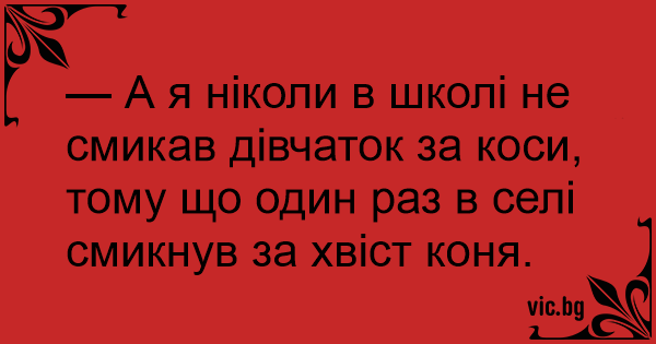 — А я ніколи в школі не смикав дівчаток за коси, тому що один раз в селі смикнув за хвіст коня.