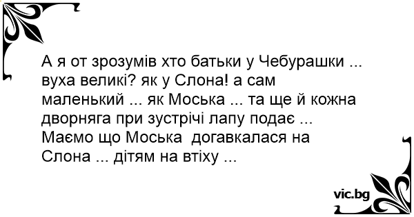А я от зрозумів хто батьки у Чебурашки ... вуха великі? як у Слона! а сам маленький ... як Моська ... та ще й кожна дворняга при зустрічі лапу подає ...