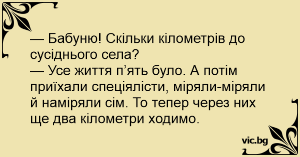 — Бабуню! Скільки кілометрів до сусіднього села?