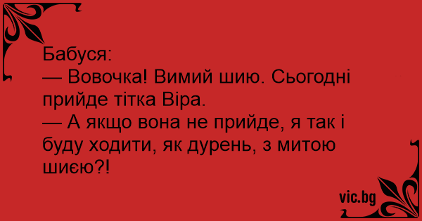 — Вовочка! Вимий шию. Сьогодні прийде тітка Віра.