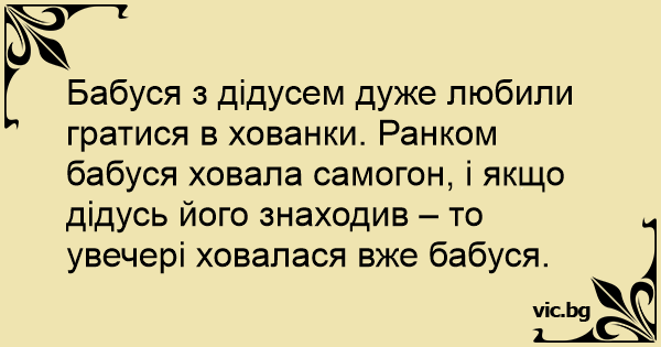 Бабуся з дідусем дуже любили гратися в хованки. Ранком бабуся ховала самогон, і якщо дідусь його знаходив – то увечері ховалася вже бабуся.