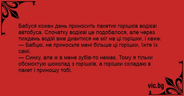 Бабуся кожен день приносить пакетик горішків водієві автобуса. Спочатку водієві це подобалося, але через тиждень водій вже дивитися не міг на ці горішки, і каже: