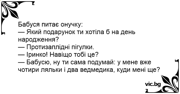 — Бабусю, ну ти сама подумай: у мене вже чотири ляльки і два ведмедика, куди мені ще?