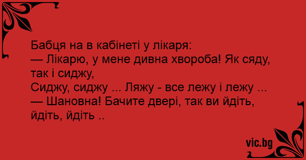 — Лікарю, у мене дивна хвороба! Як сяду, так і сиджу,