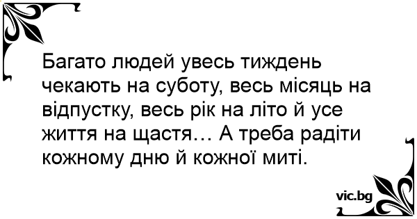 Багато людей увесь тиждень чекають на суботу, весь місяць на відпустку, весь рік на літо й усе життя на щастя… А треба радіти кожному дню й кожної миті.