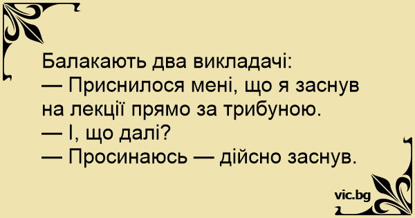 Балакають два викладачі:<br />— Приснилося мені, що я заснув на лекції прямо за трибуною.<br />— І, що далі?<br />— Просинаюсь — дійсно заснув.
