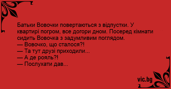 Батьки Вовочки повертаються з відпустки. У квартирі погром, все догори дном. Посеред кімнати сидить Вовочка з задумливим поглядом.