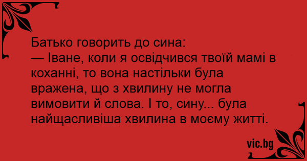 — Іване, коли я освідчився твоїй мамі в коханні, то вона настільки була вражена, що з хвилину не могла вимовити й слова. І то, сину... була найщасливіша хвилина в моєму житті.