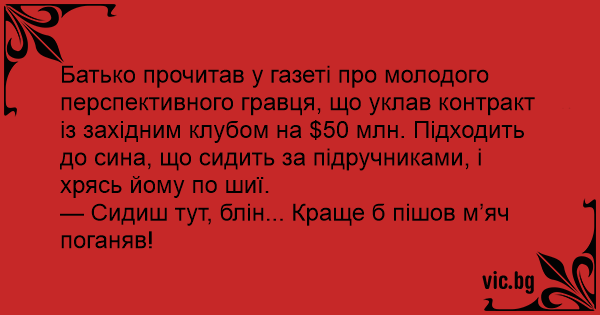Батько прочитав у газеті про молодого перспективного гравця, що уклав контракт із західним клубом на $50 млн. Підходить до сина, що сидить за підручниками, і хрясь йому по шиї.