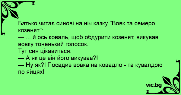 — Ну як?! Посадив вовка на ковадло - та кувалдою по яйцях!