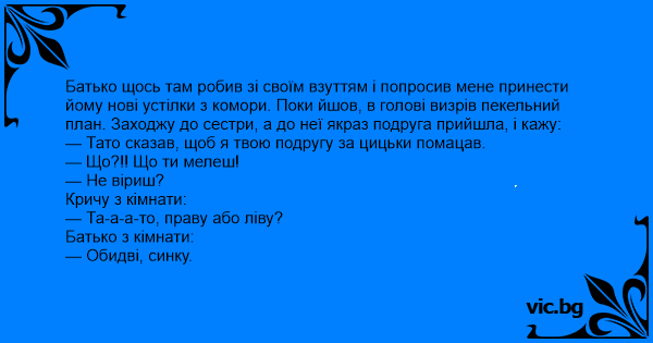 Батько щось там робив зі своїм взуттям і попросив мене принести йому нові устілки з комори. Поки йшов, в голові визрів пекельний план. Заходжу до сестри, а до неї якраз подруга прийшла, і кажу: