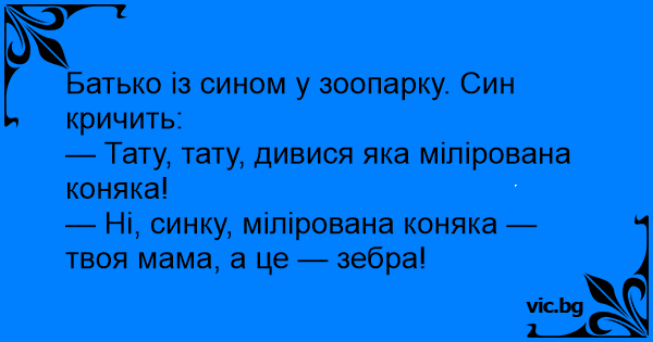 Батько із сином у зоопарку. Син кричить:<br />— Тату, тату, дивися яка мілірована коняка!<br />— Ні, синку, мілірована коняка — твоя мама, а це — зебра!
