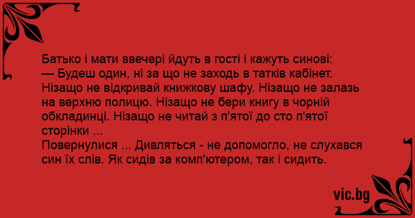 — Будеш один, ні за що не заходь в татків кабінет. Нізащо не відкривай книжкову шафу. Нізащо не залазь на верхню полицю. Нізащо не бери книгу в чорній обкладинці. Нізащо не читай з п'ятої до сто п'ятої сторінки ...