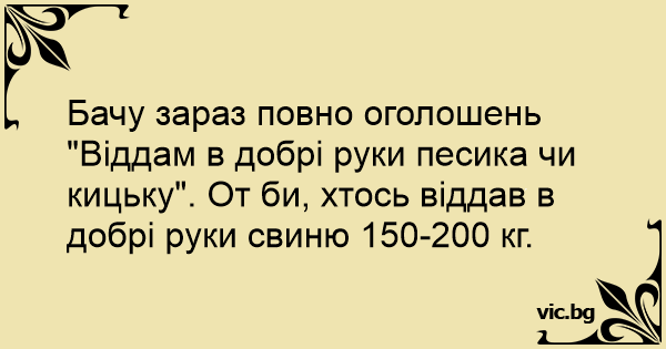 Бачу зараз повно оголошень "Віддам в добрі руки песика чи кицьку". От би, хтось віддав в добрі руки свиню 150-200 кг.