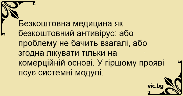 Безкоштовна медицина як безкоштовний антивірус: або проблему не бачить взагалі, або згодна лікувати тільки на комерційній основі. У гіршому прояві псує системні модулі.