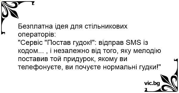 "Сервіс "Постав гудок!": відправ SМS із кодом... , і незалежно від того, яку мелодію поставив той придурок, якому ви телефонуєте, ви почуєте нормальні гудки!"