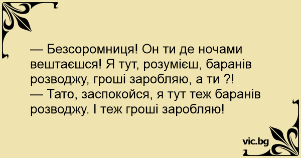 — Безсоромниця! Он ти де ночами вештаєшся! Я тут, розумієш, баранів розводжу, гроші заробляю, а ти ?!