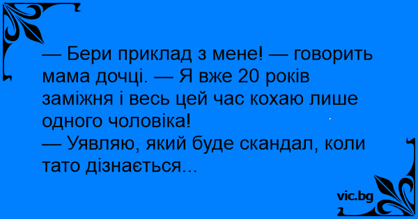 — Бери приклад з мене! — говорить мама дочці. — Я вже 20 років заміжня і весь цей час кохаю лише одного чоловіка!