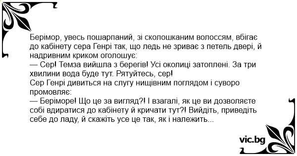 — Сер! Темза вийшла з берегів! Усі околиці затоплені. За три хвилини вода буде тут. Рятуйтесь, сер!