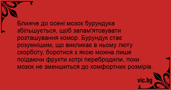 Ближче до осені мозок бурундука збільшується, щоб запам'ятовувати розташування комор. Бурундук стає розумнішим, що викликає в ньому люту скорботу, боротися з якою можна лише поїдаючи фрукти котрі перебродили, поки мозок не зменшиться до комфортних розмірів.